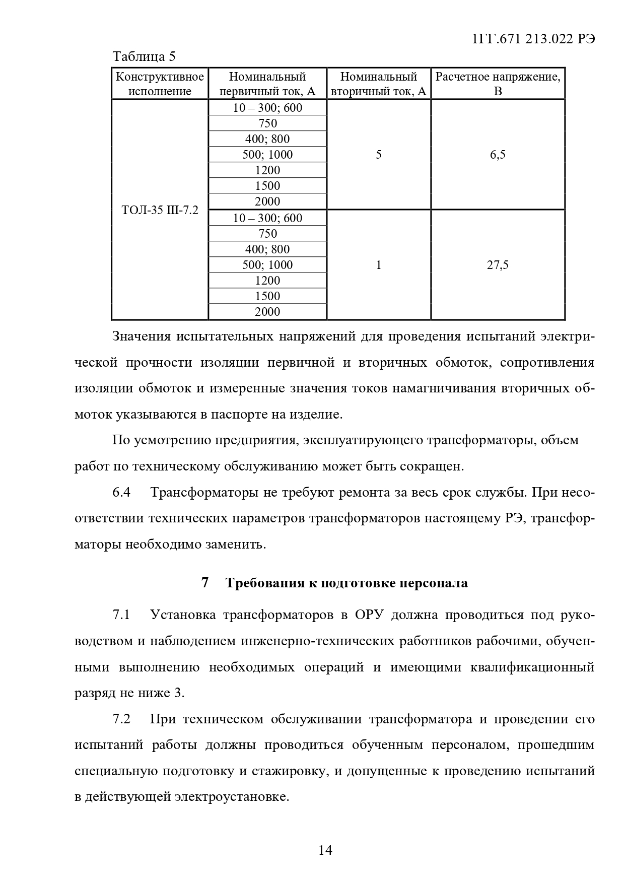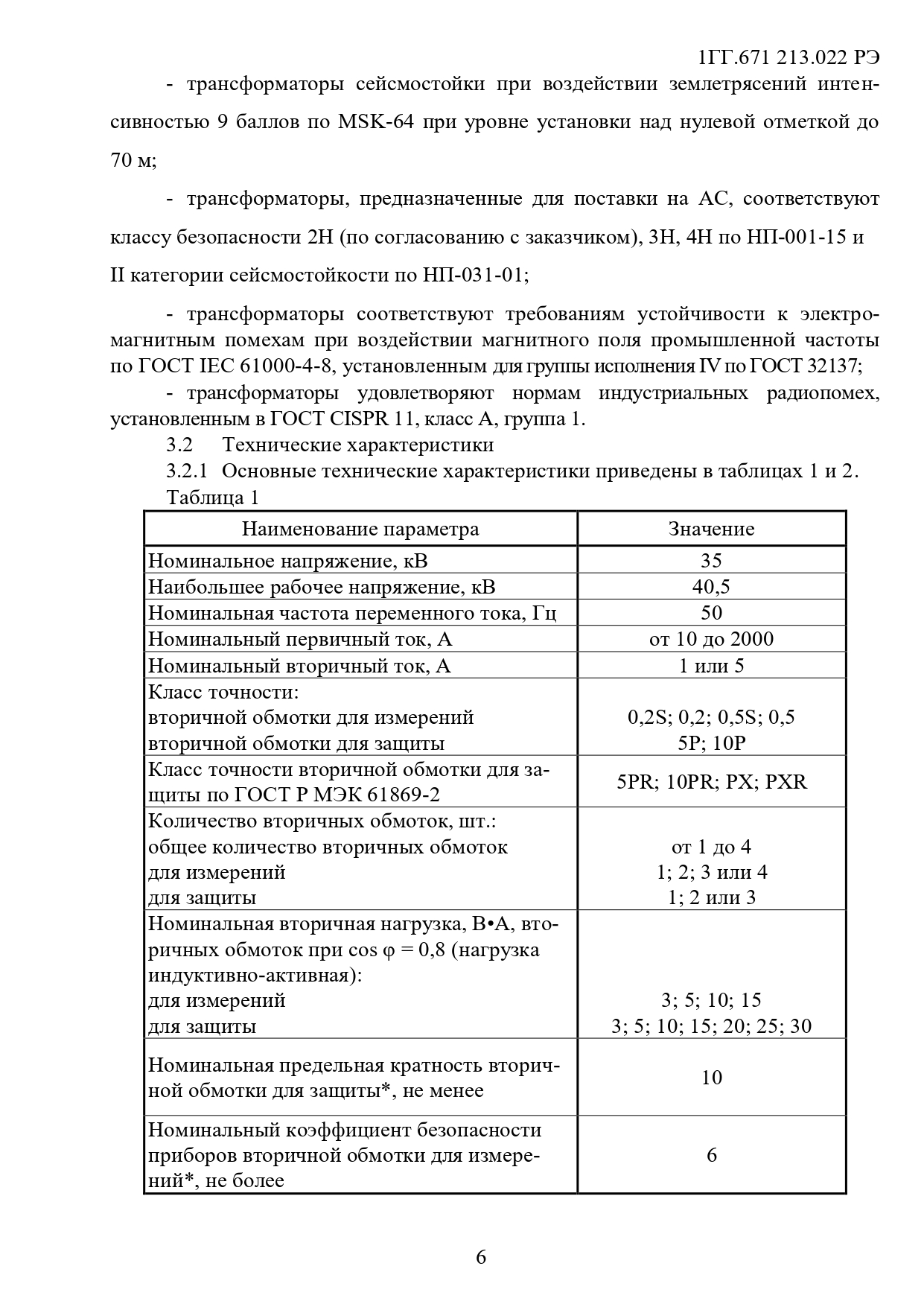 Технические характеристики трансформаторов ТОЛ-35 III-7.2 (табл. 1)