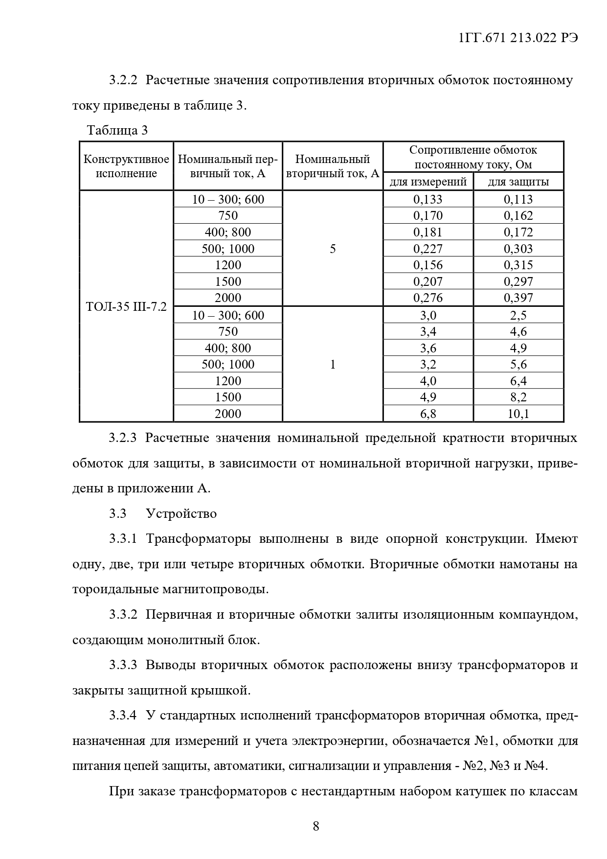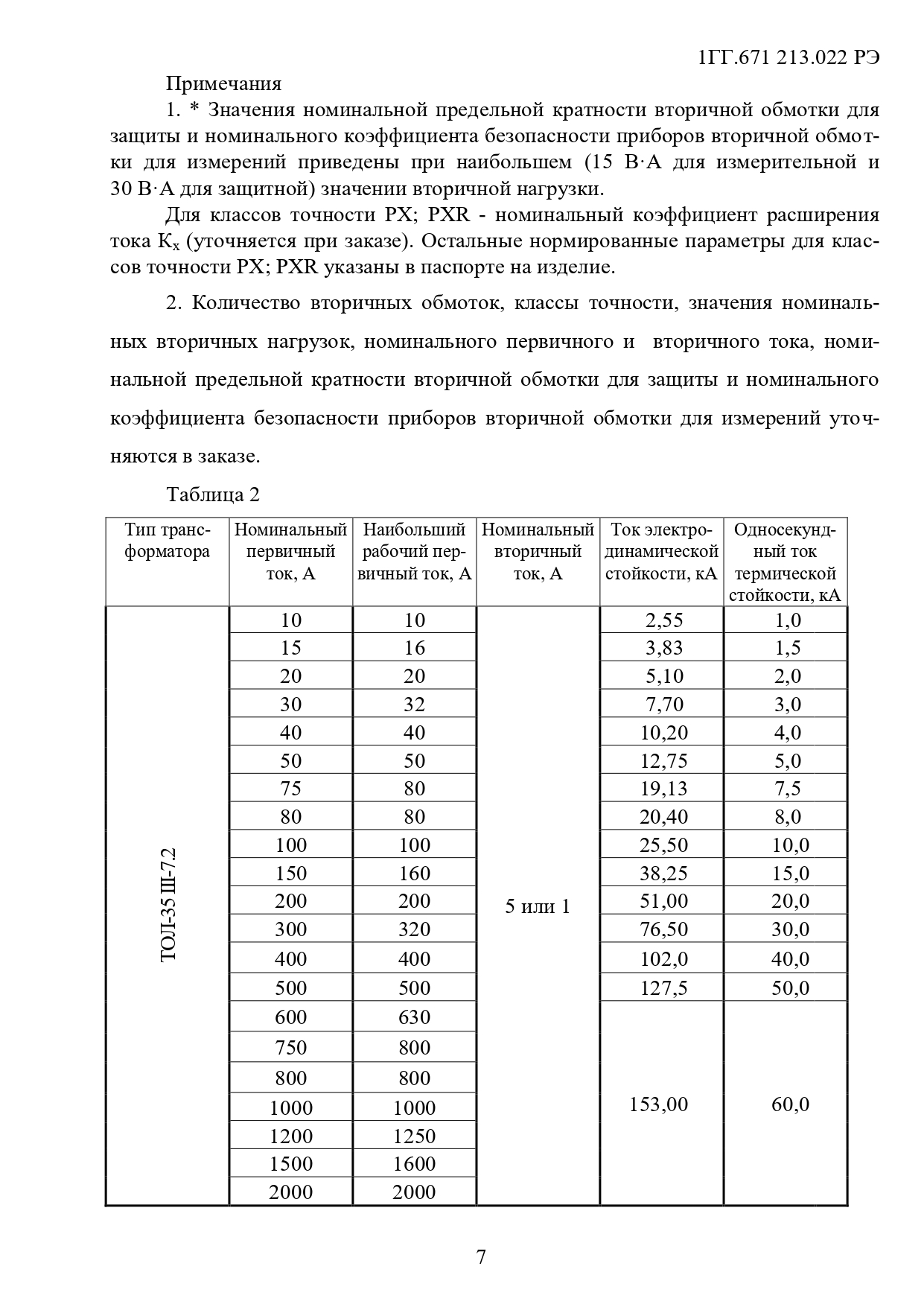 Технические характеристики трансформаторов ТОЛ-35 III-7.2 (табл. 2)